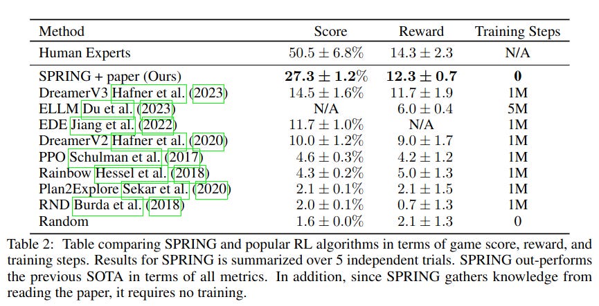 However, popular AI YouTuber Edan Mayer argues in his video review that the paper makes an unfair comparison to RL methods by limiting them to only 1 million training steps, whereas the pre-training of GPT-4 uses massive datasets. He notes that state-of-the-art DreamerV3 actually achieves over double the reward of 16 on Crafter when allowed to train for 10-20 million steps. Mayer suggests that comparing to the best RL methods without limiting experience would be more representative. While SPRING demonstrates the ability of large LLMs to understand papers and perform reasoning when prompted appropriately, the comparison to RL algorithms constrained to 1 million steps may exaggerate its advantage. Still, the zero-shot transfer of knowledge from a paper to gameplay has exciting implications. The authors suggest SPRING could enable integrating human knowledge into RL training. More broadly, the reliability shown in reasoning with technical documents opens up possibilities for LLMs to rapidly acquire expertise or assist human experts across fields. However, the approach still requires a manually designed visual observation module. Future work should investigate how to make systems like this more generalizable.