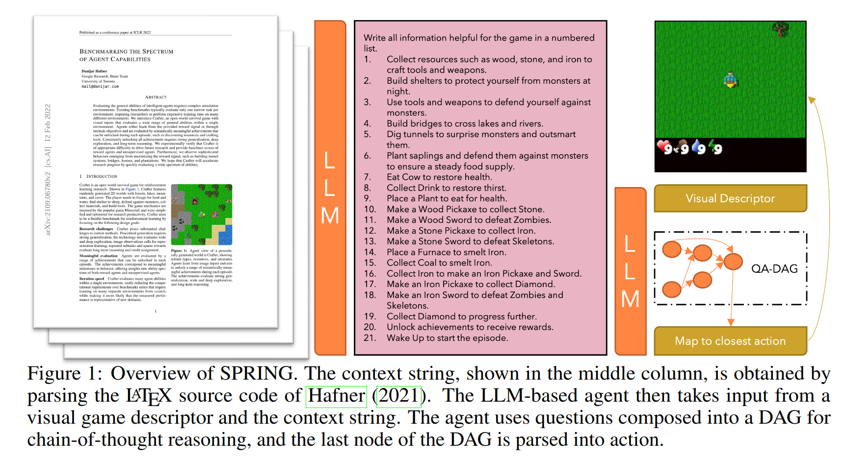 A new approach called SPRING allows large language models (LLMs) like GPT-4 to achieve strong performance in the challenging Crafter benchmark without any training, simply by reading the academic paper describing the environment. In the paper "SPRING: GPT-4 Out-performs RL Algorithms by Studying Papers and Reasoning", researchers from Carnegie Mellon University, Microsoft and other institutions propose a two-stage approach called SPRING.