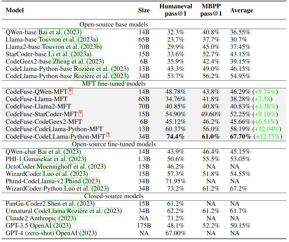 Experiments demonstrate MFTCoder's superiority over traditional approaches of individual task fine-tuning or mixed-task fine-tuning. When implemented with CodeLLama-34B-Python as the base model, MFTCoder achieved a remarkable 74.4% pass@1 score on the HumanEval benchmark. This even surpasses GPT-4's 67% zero-shot performance (as reported in original paper)