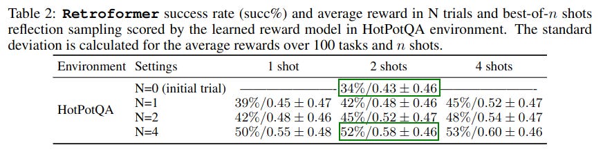 The results indicate that current LLMs still struggle with credit assignment - understanding the root causes behind multi-step failures. By learning to generate focused reflections, Retroformer agents act more rationally, preventing repetitive mistakes. The structured self-critiquing learned by the retrospective model leads to faster skill acquisition.