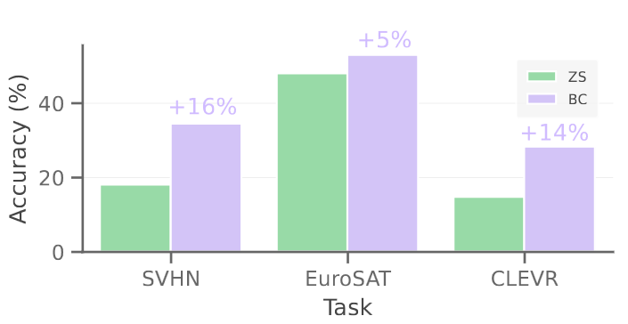 BC was also extended to calibrate vision-language models like CLIP in zero-shot image classification. Again substantial gains were achieved, showing the broad applicability of the method.